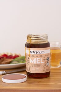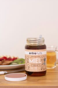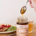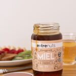 La miel líquida EntreNuts es un producto 100% puro y natural, caracterizado por su textura fluida, color dorado brillante y sabor suave. Es ideal para endulzar infusiones, yogures y repostería, destacándose por ser libre de gluten (sin TACC), certificada Kosher y sin conservantes, con un práctico envase de 500g.